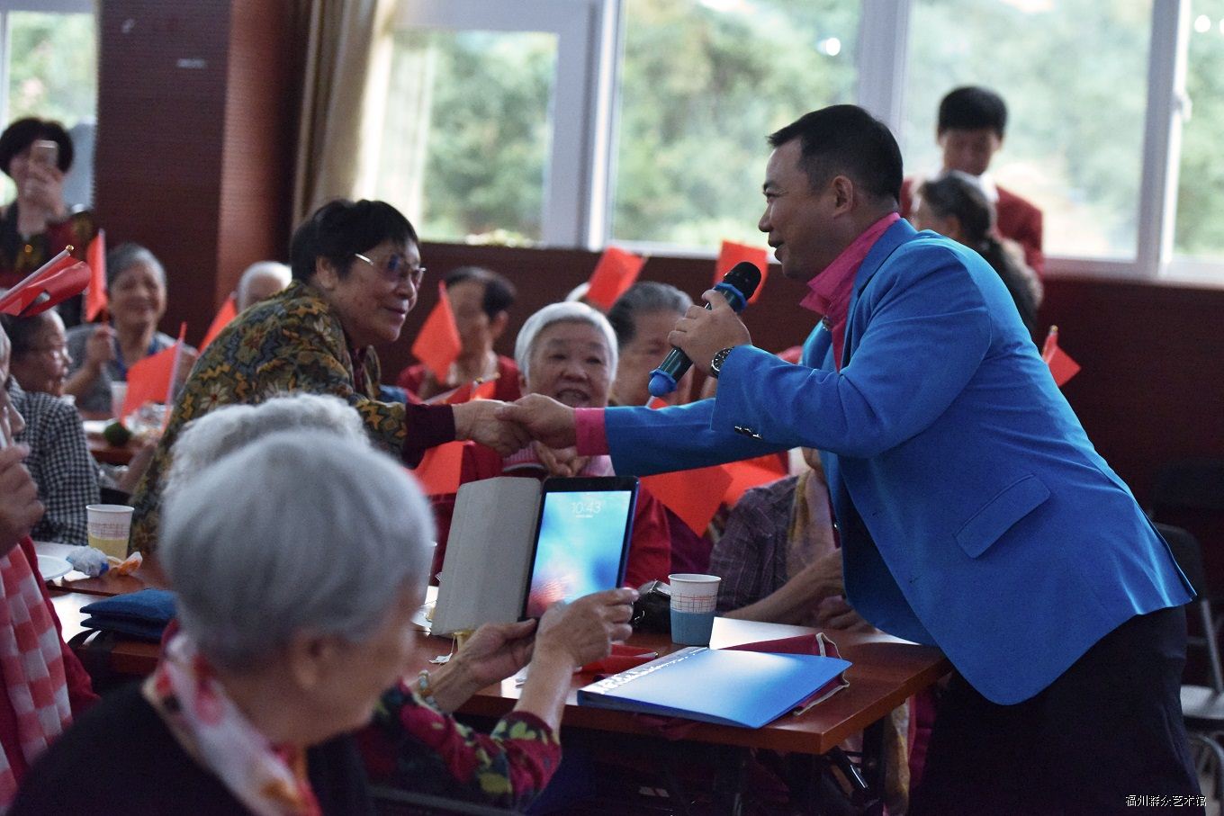 九九重阳日,浓浓敬老情,今天上午,福州市社会福利院内十分热闹,我馆文化志愿者在提倡尊老、敬老、爱老、助老传统美德的重阳佳节之际走进福利院开展慰问演出和综合性文化服务,为老人们献上了一份精彩丰盛、满溢着爱心与暖意的文化大餐。